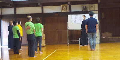 千原先生のご指導の下、武蔵の心構え、体、技を教えていただき、その後竹刀を持っての実技の指導がありました。
